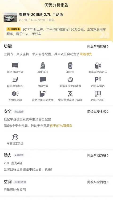 虽然普拉多并不能完全称得上是硬派越野车,但是凭借着它出色的道路适应能力和相对舒适的乘坐体验,受到了很多人的欢迎。不过这款普拉多 2016款 2.7L 手动版的报价并不算低,虽说普拉多的保值率比较高,但是也跑了不少的里程,还是要综合评估车况后再做决定。