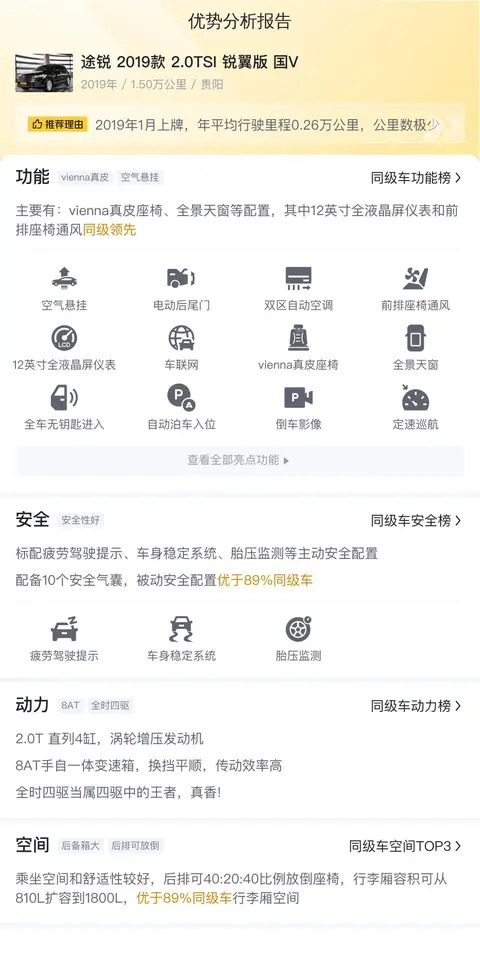 报价远低于市场行情,途锐 2019款 2.0TSI 锐翼版 国V的市场行情价是27.63万-38.44万,它的报价则是24.80万,价格上有很大优势,同时60.69%的保值率也高,因为同级车的保值率也才52.66%。