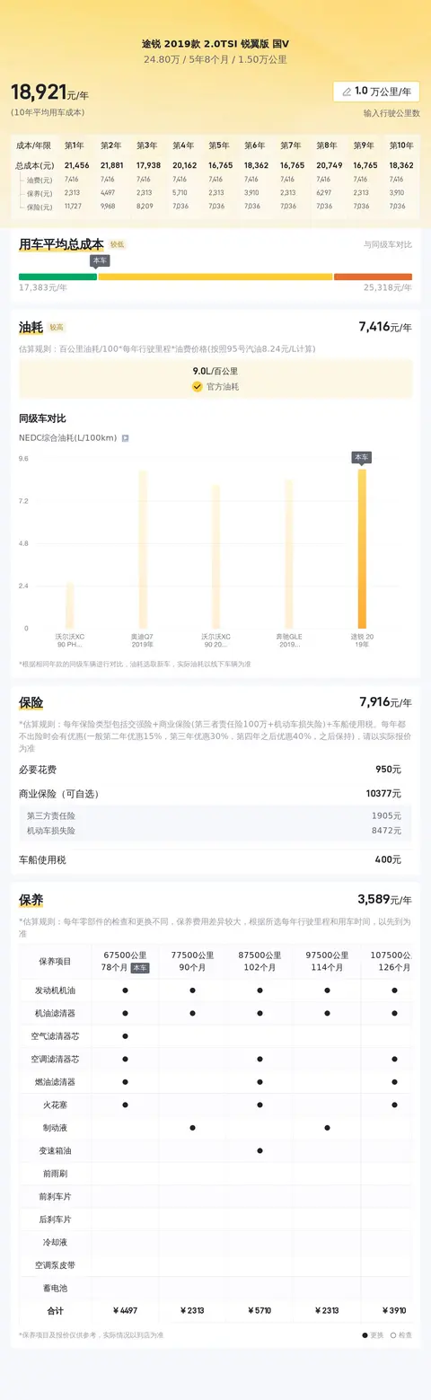 据估算,同级车的最低用车成本是13980元/年,最高是22744元/年,途锐 2019款 2.0TSI 锐翼版 国V是18560元/年,不算低,但也不算高,所以是可以接受的。