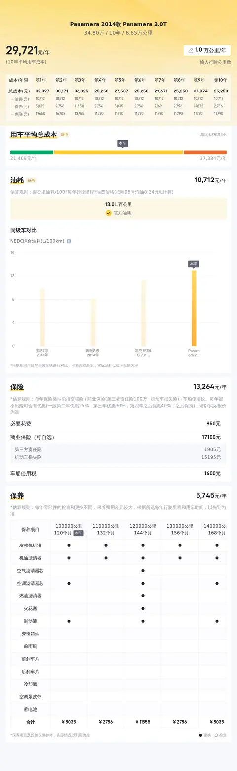 据估算,同级车的最低用车成本是18783元/年,最高是33774元/年,Panamera 2014款 Panamera 3.0T是29674元/年,所以不算低。