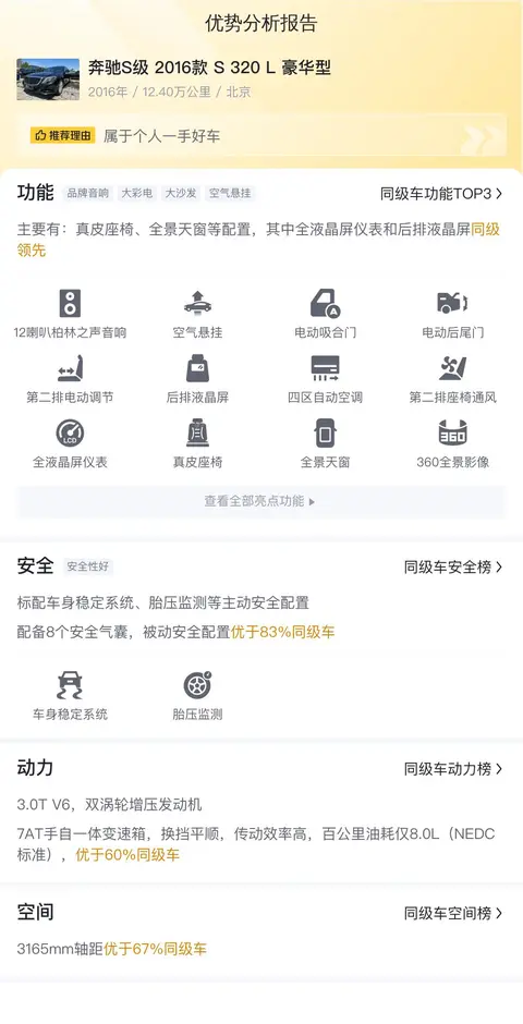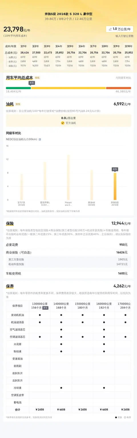 根据懂车帝的大数据分析,这款二手奔驰S级2016款S320L豪华型的十年平均用车成本约为23,681元/年,百公里油耗约为10.2L。这一数据基于实际用户的使用情况和维护记录,为您提供了一个参考范围。然而,请注意,实际用车成本可能会因多种因素而有所不同,包括驾驶习惯、行驶里程、油价波动、保险费用、维修保养费用等。在购买二手车时,除了考虑购车成本外,还应该合理预期日后的用车成本。建议您在购车前,对这款车的常见故障和维修问题进行了解,并预留一定的预算用于日常维护和潜在的修理费用。此外,定期的保养和检查可以帮助您减少未来的维修成本,并保持车辆的良好状态。