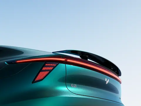 极越07在外观设计方面,还是很有大车风范的,接近5米的车长,让这款车的外观造型整体很流畅,加上掀背造型,让这款车看上去很有运动感,同时这款车采用了贯穿式前LED日间行车灯和不规则造型的大灯,让这款车的前脸,看上去也很有辨识度。侧面则用到了低风阻轮毂和无框车门,而且没有设置物理门把手,尾部则用到了贯穿式尾灯和下扰流板造型,整体设计还是非常成熟到位的。