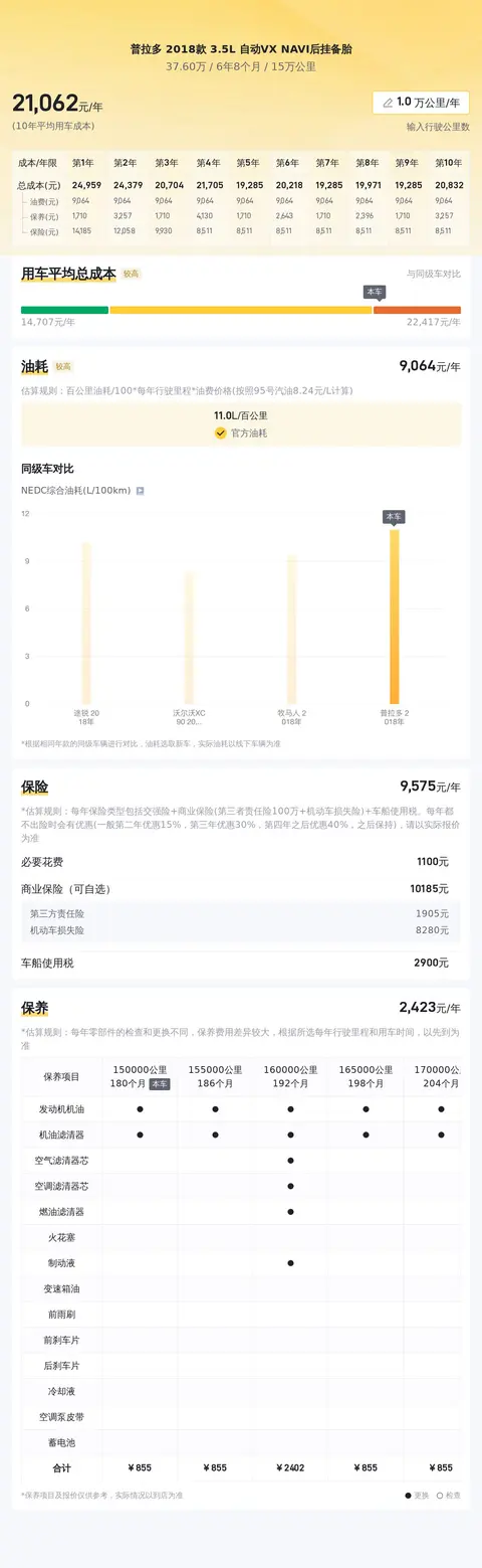 据估算,同级车的最低用车成本是14983元/年,最高是22476元/年,普拉多 2018款 3.5L 自动VX NAVI后挂备胎是21138元/年,所以用车成本相对较高。