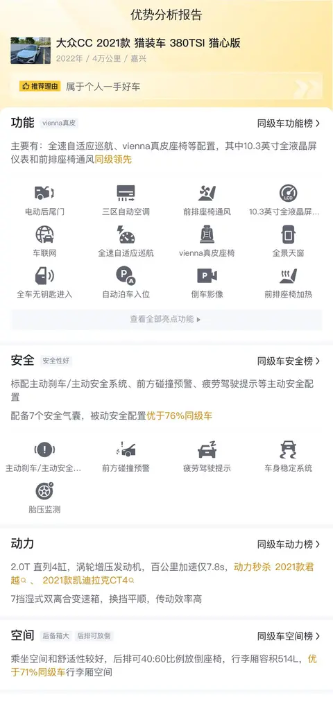 毕竟是2021款的车,所以配置也比较丰富。大众CC 2021款 猎装车 380TSI 猎心版配备了全速自适应巡航、真皮座椅、L2辅助驾驶、三区自动空调等配置。安全配置上,标配主动刹车/主动安全系统、前方碰撞预警、车道保持辅助系统等主动安全配置,配备6个安全气囊,被动安全配置优于90%同级车。