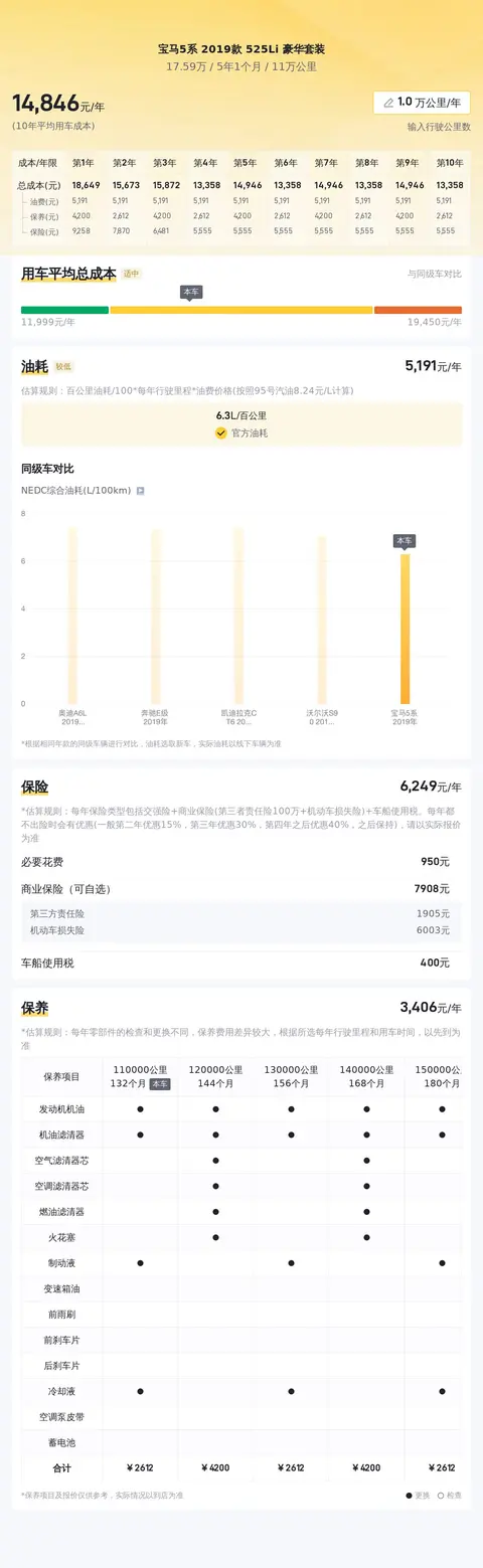 宝马5系525Li豪华套装的车辆使用成本受到多种因素的影响,包括油耗、保养、保险以及可能的维修费用等。接下来,我们将对这些方面的成本进行详细的解析。油耗成本:2019款宝马5系525Li豪华套装搭载的2.0T发动机在保证动力性能的同时,也具有较好的燃油经济性。根据官方数据,该车的综合油耗约为6.3L/100km。然而,实际油耗会受到驾驶习惯、路况等多种因素的影响,可能会有所波动。按照每年行驶2万公里计算,每年的油费支出大约在11,000元左右(假设油价为8.2元/L)。保养成本:宝马作为豪华品牌,其车辆的保养成本相对较高。通常,宝马5系525Li豪华套装的年度保养费用大约在3,000元左右,但这也会根据车辆的实际使用情况和保养项目的不同而有所变化。保险成本:车辆保险是每年必不可少的开支,包括交强险、商业险等。交强险是法定保险,首年费用为950元,次年起根据上一年的出险情况进行浮动。商业险则根据投保的具体内容和金额有所不同,但通常一年的保险费用大约在6,000元左右。维修费用:车辆在使用过程中难免会出现一些小的磨损或故障,这部分费用因人而异,难以给出准确的预估。如果车辆在保修期内,大部分维修费用可能会由厂家承担。综上所述,2019款宝马5系525Li豪华套装的年使用成本大约在20,000元至22,000元之间,具体数额会根据车辆的实际使用情况和个人驾驶习惯等因素有所差异。对于一款豪华中大型轿车而言,这样的使用成本属于正常范围之内。