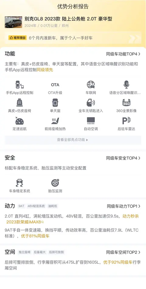 别克GL8(图片|配置|询价) 2023款 陆上公务舱 2.0T 豪华型是一款高端商务MPV,专为企业用户和高端家庭设计。它在公务和家庭出行中提供了卓越的舒适性和豪华体验,被誉为“陆地公务舱”。这款车在市场上的口碑非常好,用户反馈强调了其舒适的乘坐体验、强劲的动力性能和高档的内饰,使其成为商务接待和家庭出行的理想选择。今天咱们要说的这款车,简直是创纪录的存在,2024年7月上牌,仅行驶了100公里,报价22.58万,绝对属于准新车了。