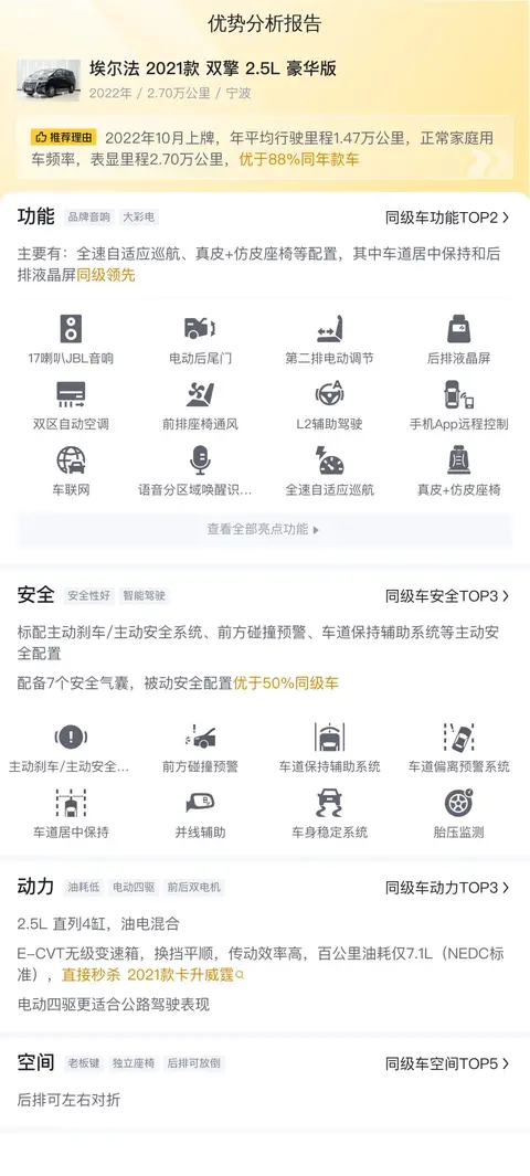 综上所述的新车含税价、用车成本、市场行情、优势分析、同款比价等数据仅供参考。在配置部分,因为二手车非标品,车辆可能会存在配置改装的情况,具体车况信息需要线下结合车辆实际情况进行综合参考。