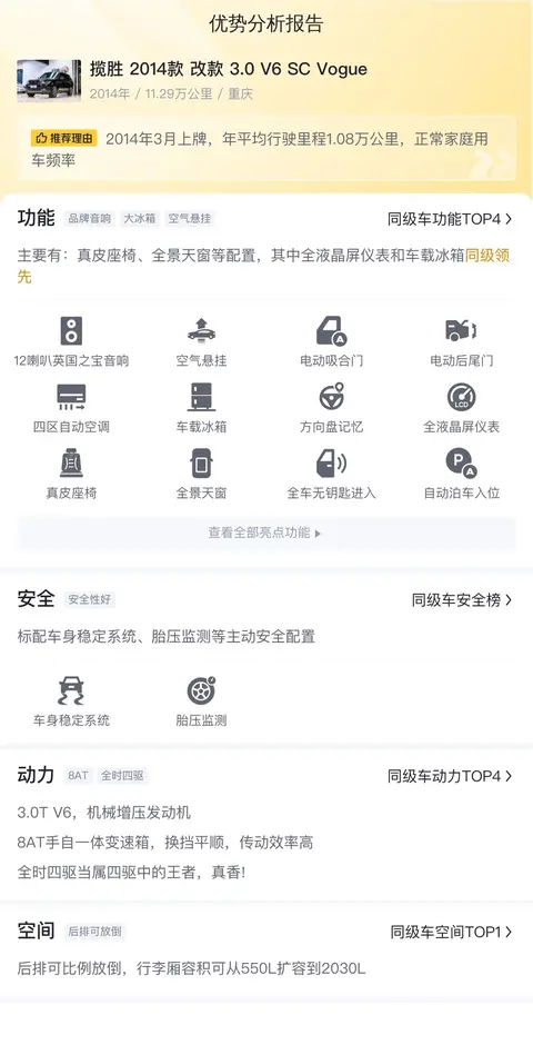 综上所述的新车含税价、用车成本、市场行情、优势分析、同款比价等数据仅供参考。在配置部分,因为二手车非标品,车辆可能会存在配置改装的情况,具体车况信息需要线下结合车辆实际情况进行综合参考。