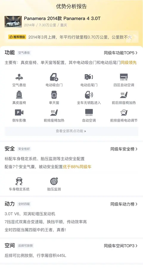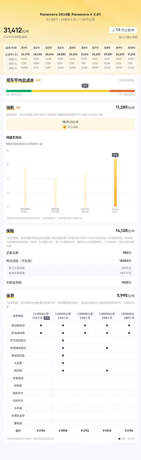 据估算,同级车的最低用车成本是21778元/年,最高是37684元/年,Panamera 2014款 Panamera 4 3.0T是31138元/年,用车成本不算低。