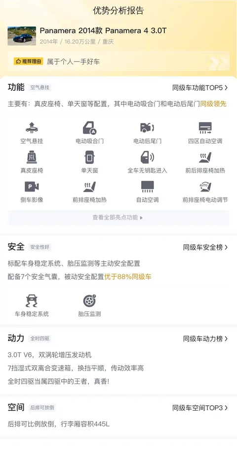 这辆Panamera 2014款 Panamera 4 3.0T的优势之一便是其强大的动力系统,3.0T V6双涡轮增压发动机提供了强劲而迅猛的加速性能,使得驾驶体验充满激情与活力。其次,车辆的内饰采用了高品质材料,展现出保时捷对细节的精益求精,为驾乘者带来了豪华且舒适的座舱环境。此外,先进的安全配置如车身稳定系统、胎压监测以及多个安全气囊,确保了行车过程中的安全性,让驾驶者能够更加安心地享受驾驶乐趣。然而,作为一款高性能豪华轿车,这辆车也存在一些不足之处。首先,由于其强大的动力系统和复杂的机械结构,维修保养的成本相对较高,需要定期投入较多的资金和时间进行维护。其次,车辆的燃油经济性并不理想,较高的油耗可能会增加日常使用的成本。最后,考虑到这辆车已经行驶了16万公里且使用时间较长,潜在的机械问题和故障风险也相对较高,需要购买者在购买前进行仔细的检查和评估。