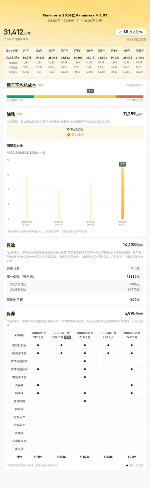据估算,同级车的最低用车成本是21781元/年,最高是37774元/年,Panamera 2014款 Panamera 4 3.0T是31134元/年,用车成本适中,不占优势。