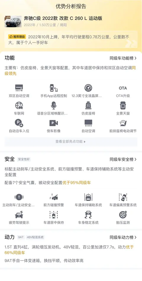 另外,同级车的最低10年平均用车成本是6531元/年,最高是14023元/年,奔驰C级 2022款 改款 C 260 L 运动版是13277元/年,用车成本也偏高。