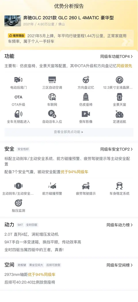 要说奔驰品牌中能疯狂赚钱的车型,轿车里数奔驰E级算是能手。在SUV市场,那就要看奔驰GLC(图片|配置|询价)了。数据显示,奔驰GLC在2020年一共 sold out 160893辆,成功拿下年度中型SUV销冠。不仅与宝马X3、奥迪Q5L拉开较大距离,更实现了31.7%的同比正增长。好了,今天的知识分享环节完毕,下面我们将为大家带来一辆二手奔驰GLC 2021款 GLC 260 L 4MATIC 豪华型,让我们一起来看看这辆二手车的表现如何。