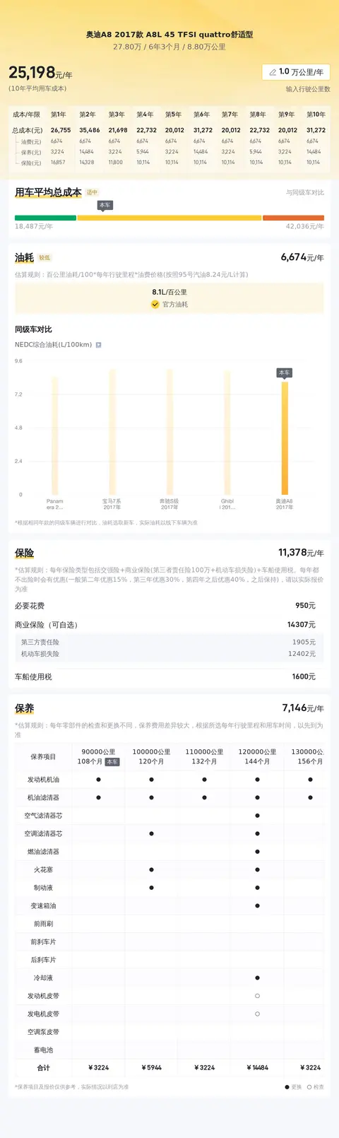 市场行情也是决定这款车价值的重要因素。目前,这款奥迪A8L的二手车行情大致在24万至30万左右。用车成本也是每个车主必须考虑的实际情况。根据估算,这辆车的年均综合用车成本在2.5万元左右,当然具体用车成本金额还是根据车辆的实际使用情况而决定的。