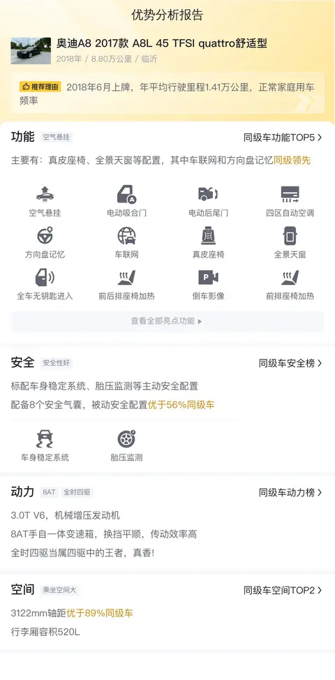 综上所述的新车含税价、用车成本、市场行情、优势分析、同款比价等数据仅供参考。在配置部分,因为二手车非标品,车辆可能会存在配置改装的情况,具体车况信息需要线下结合车辆实际情况进行综合参考。