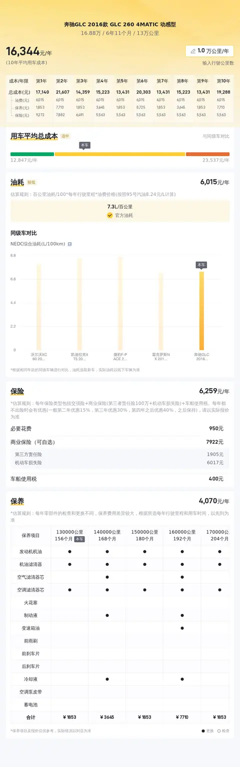 据估算,同级车的最低用车成本是11445元/年,最高是18170元/年,奔驰GLC 2016款 GLC 260 4MATIC 动感型是15727元/年,整体用车成本不算低。