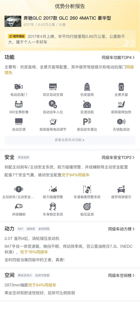 这辆奔驰GLC 2017款 GLC 260 4MATIC 豪华型的优点在于配置比较全面,不仅配备了主动刹车/主动安全系统、前方碰撞预警、车道偏离预警系统等主动安全配置,还配备了7个安全气囊。同时奔驰的驾乘感受依旧出色,后排空间也比较宽敞。