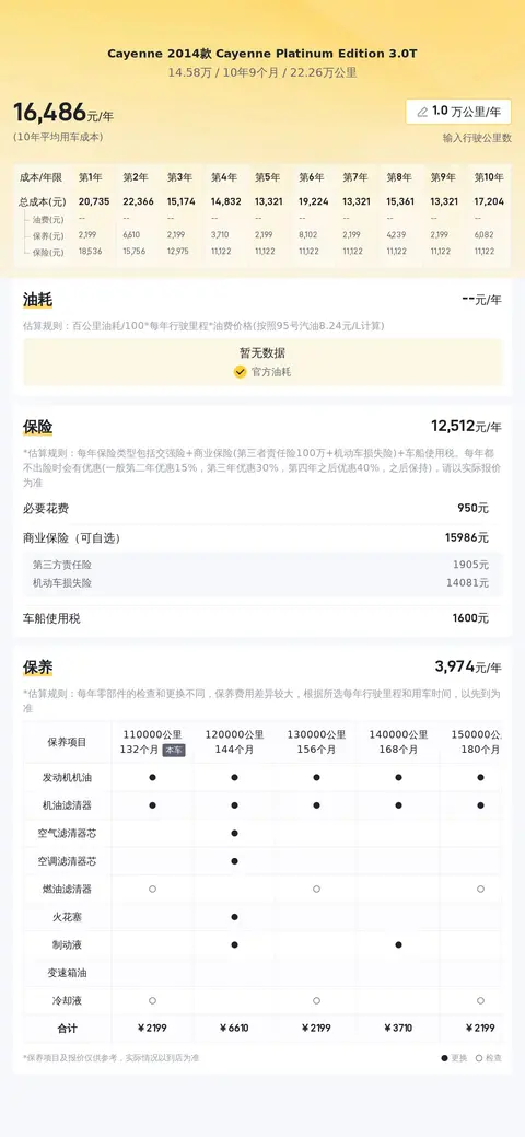 当前,这款Cayenne的二手车市场行情大致位于12万至15万之间,当然市场价格会根据具体的车况有所调整。就用车成本而言,预估的十年平均用车成本约为21659元/年,这一数字相较于同级车型处于适中水平,合理且可控。