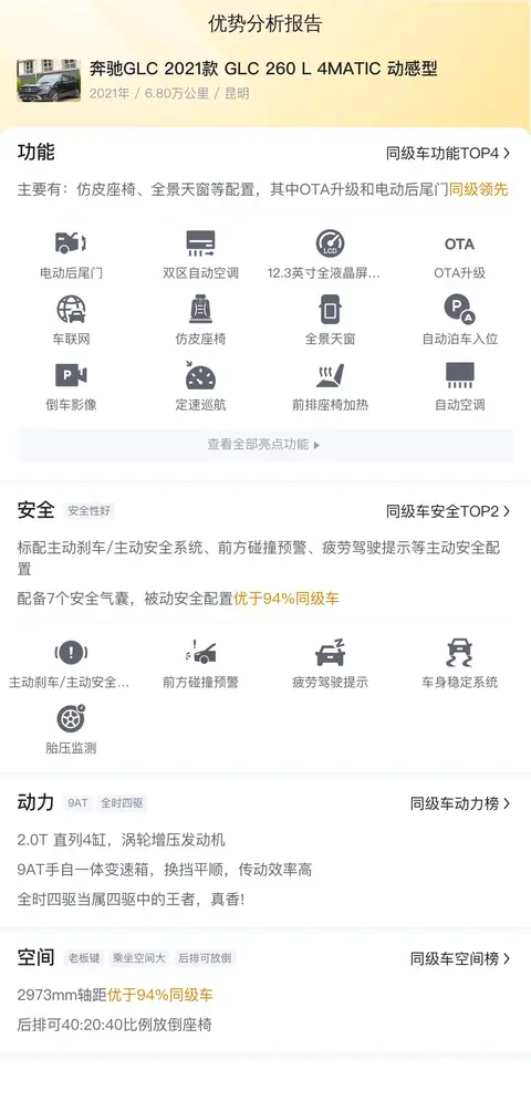 综上所述,奔驰GLC以其出色的驾乘体验、丰富的配置以及较强的动力性能,赢得了市场的广泛认可。这款奔驰GLC 2021款 GLC 260 L 4MATIC 动感型的价格很实惠,只有23.38万,行驶里程只有6.80万公里,性价比很高。如果你正在寻找一款高品质的中型SUV,那么奔驰GLC是一个值得考虑的选择。