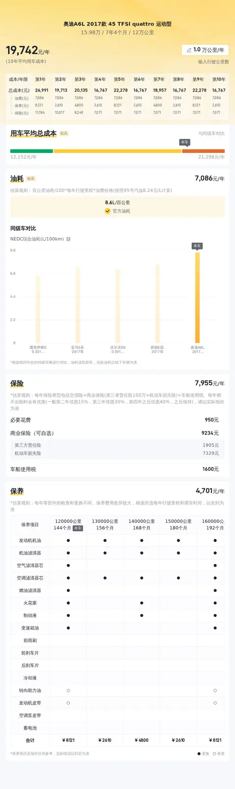 此外,这款车的百公里油耗为8.6升,考虑到其强劲的动力性能,这样的油耗表现可谓相当出色,既满足了驾驶的乐趣,又兼顾了经济实用性。从保养成本来看,这辆车每年的保养费用大约为2380元,这样的维护成本在同级别车型中属于合理范围,既能保证车辆的良好状态,又不会给车主带来过大的经济压力。