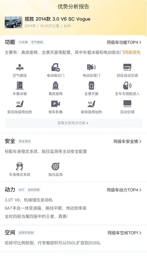 优势方面,这台揽胜的舒适性配置丰富,还配有第二排电动调节,同级领先;同时它的行李厢空间也较大,同级领先。而在动力方面,它的动力很强,表现也不错。