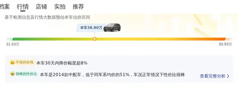 揽胜的市场行情价是31.03万-50.93万,它的报价则是38.80万,价格处于适中范围,不过它的保值率较高,因为它的保值率是47.02%,而同级车的是38.08%。