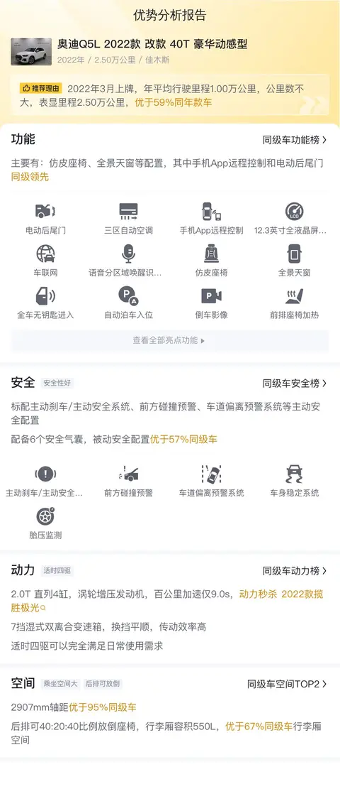 优点是,车子比较新,基本是准新车,配置丰富,动力强劲,而且奥迪Q5L空间大,品质好,具有一定的吸引力。