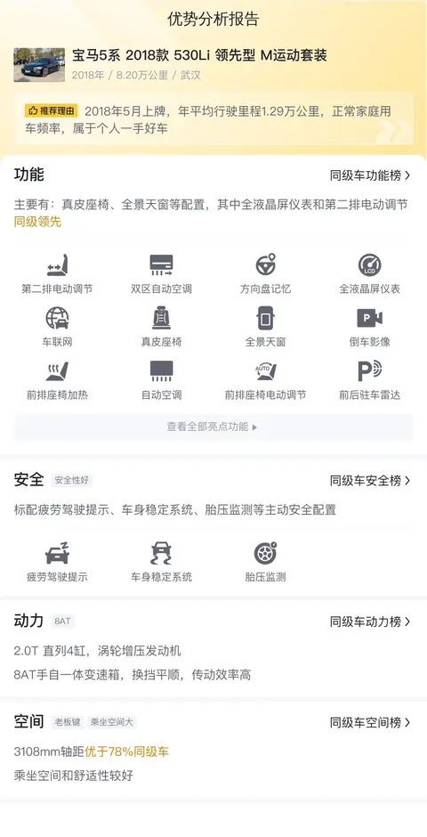 综上所述,2018款宝马5系530Li领先型M运动套装作为一款集豪华、科技、性能于一体的中大型轿车,在二手车市场上依然保持着极高的吸引力。无论是在外观设计、内饰品质、空间表现还是动力操控等方面,它都展现出了宝马品牌的精湛工艺和卓越实力。这款车型主要面向追求高品质生活、注重驾驶体验并具备一定经济基础的消费群体。他们往往对车辆的舒适性、豪华感和科技配置有着较高要求,同时也看重车辆的保值能力和品牌形象。如果您正好符合这个画像,那么这辆二手宝马5系,您可以考虑一下。
