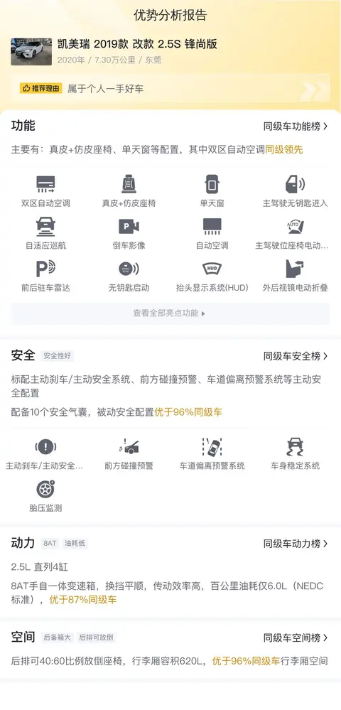 今天介绍的这款二手凯美瑞2019款改款2.5S锋尚版来自东莞,上牌日期2020年11月,表显里程7.3万公里,新车指导价22.28万,二手车报价12.88万,过户次数0次,支持分期购车,首付3.8万即可开回家。车辆配备2.5L自然吸气发动机,动力充沛,油耗低,非常适合家庭使用。车辆外观时尚大气,白色车身彰显出一种沉稳而优雅的气质,无论是在城市中穿梭还是长途旅行,都能吸引不少目光。凯美瑞一直以来都以卓越的品质和可靠性著称,作为一款中高级轿车,它在市场上的口碑一直非常好,消费者们普遍认为它是一款非常出色和可靠的车型。无论是从外观设计、内饰舒适度、动力性能还是安全配置等方面来看,凯美瑞都表现出色,深受消费者们的喜爱和信赖。因此,购买凯美瑞2019款改款2.5S锋尚版作为家庭用车,绝对是一个非常明智和划算的选择!