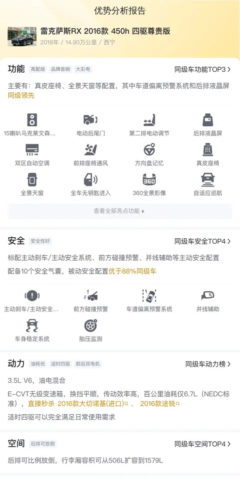 今天给大家带来的这款雷克萨斯RX 2016款 450h 四驱尊贵版上牌地为青海西宁,上牌日期2018年9月,表显里程14.9万公里,新车指导价81万,二手车报价30万,过户次数1次。