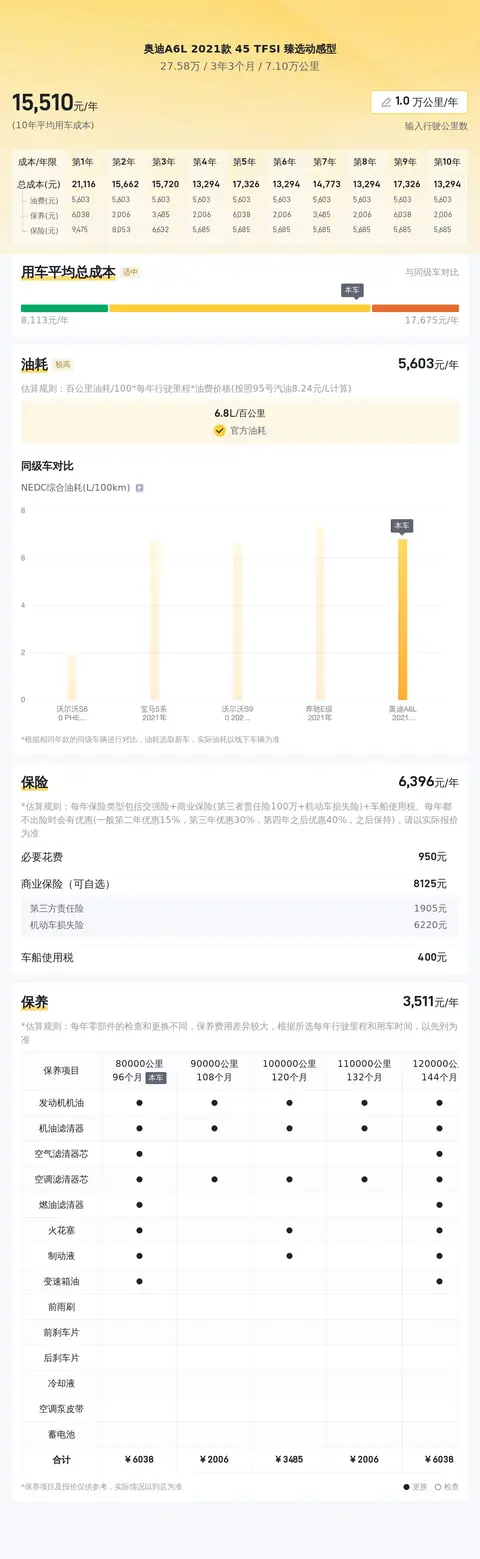 基于懂车帝大数据分析,这款奥迪A6L的市场行情在26.9万至32.7万之间,具体价格受车况、里程数、维护记录等因素影响。在用车成本方面,预估年均综合用车成本约为1.57万元,但实际支出视使用强度、环境条件及个人驾驶习惯而定。