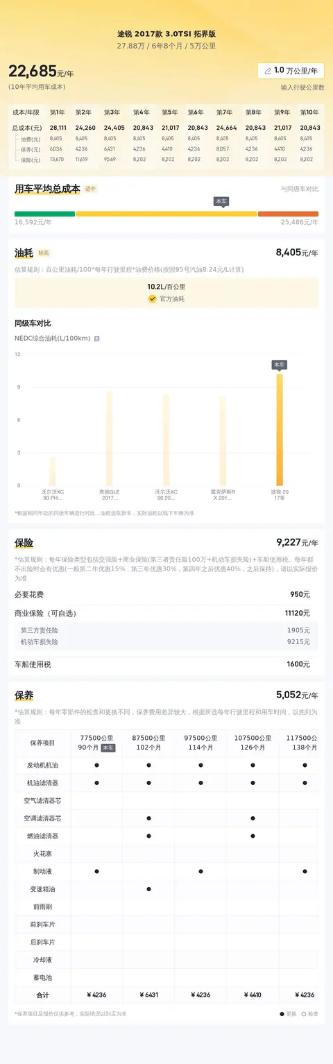 市场行情也是决定这款车价值的重要因素。目前,这款途锐的二手车行情大致在26万至33万之间。用车成本也是每个车主必须考虑的实际情况。基于当前油价和用车频率,这辆车的年均综合用车成本大约在2.3万元左右,当然具体用车成本金额还是根据车辆的实际使用情况而决定的。