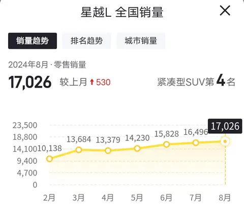星越L作为自主品牌紧凑型SUV的代表车型之一,拥有沉稳大气的外观,并且以全系2.0T动力为主要卖点,得到了众多消费者的青睐。从销量来看,这款车每个月都可以卖出1万多台,在销量排行榜中名列前茅。