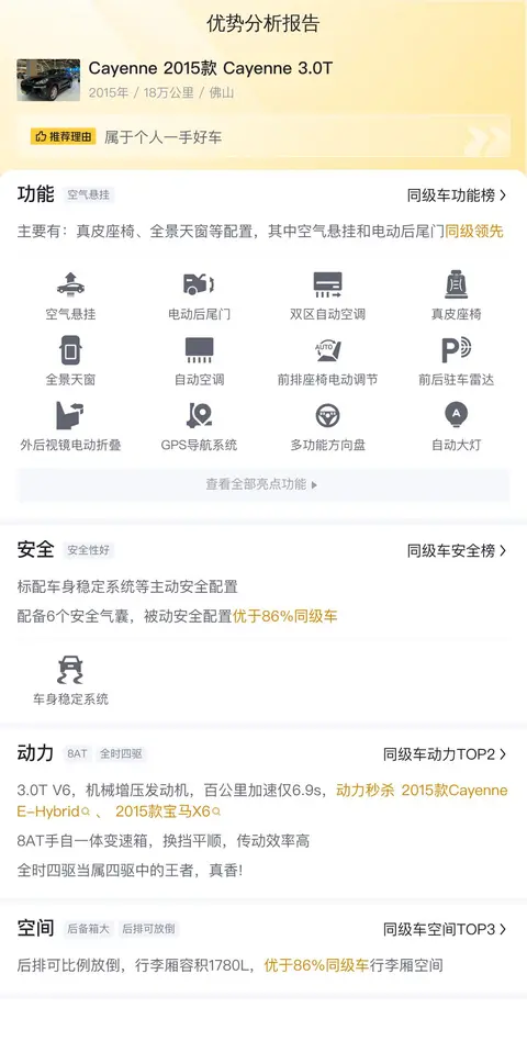 综上所述,我们对这辆Cayenne 2015款 3.0T的二手车进行了全面的介绍和分析。如果您正在寻找一款豪华SUV作为日常代步或商务出行之选,那么这款Cayenne无疑是一个值得考虑的选择。当然,在购买二手车时还需要注意车辆的状况、里程数以及保养情况等因素。希望本文能够为您提供有价值的参考信息,帮助您做出明智的购车决策。