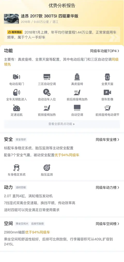据估算,同级车的最低用车成本是13198元/年,最高是19080元/年,途昂 2017款 380TSI 四驱豪华版是14180元/年,所以用车成本适中。