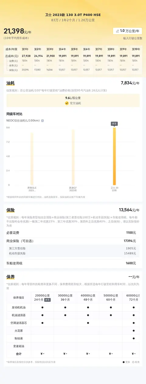 根据当前市场行情,这款二手路虎卫士130的售价在73万元至87万元之间。考虑到其车况良好、配置丰富等因素,83万元的售价相对较高。但从长期来看,由于路虎品牌的影响力和这款车的保值率较高,其价格相对稳定。在用车成本方面,这款车的百公里油耗为9.6升,按照一年行驶2万公里计算,每年的油费约为1.5万元。保险费用方面,一年约需1.2万元。保养费用方面,一年大约需要5000元。此外,还需考虑停车费、洗车费、车损费等其他费用,一年大约需要6000元。因此,总体来看,这款路虎卫士130的用车成本相对较高。