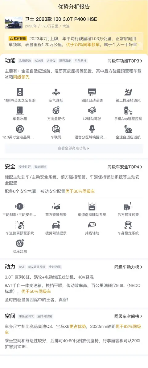 综上所述的新车含税价、用车成本、市场行情、优势分析、同款比价等数据仅供参考。在配置部分,因为二手车非标品,车辆可能会存在配置改装的情况,具体车况信息需要线下结合车辆实际情况进行综合参考。