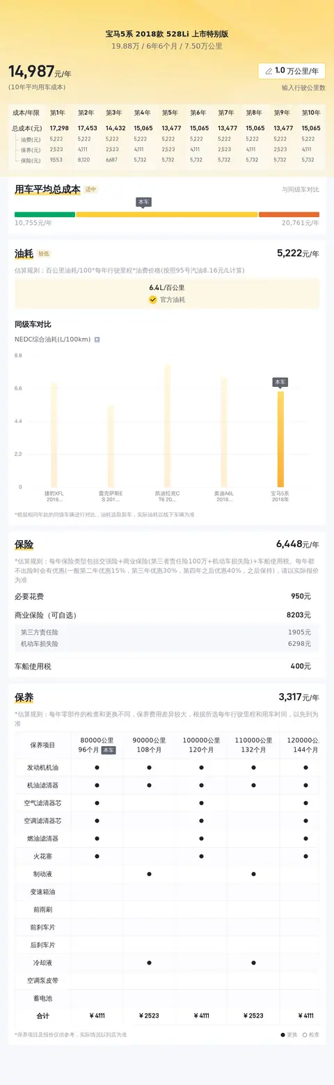 在不考虑贷款的情况下,按照每年行驶1万公里计算,懂车帝的大数据分析,这款宝马5系 2018款 528Li 上市特别版的年平均用车成本约为14,608元,其中包括油费约11,063元、保险费用约3,180元、保养费用约3,565元。值得注意的是,实际费用可能会因油价波动、保险政策和个人驾驶习惯等因素而有所不同。