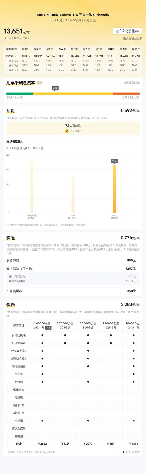 这款二手MINI的平均油耗为7.3L/100km,平均用车成本约为14176元/年,这个用车成本在同级别车型中处于较高区间。保险费用和保养费用分别为约5529元/年和1706元/年。值得注意的是,这些费用会随着具体使用情况和保险政策等因素的变化而变化。