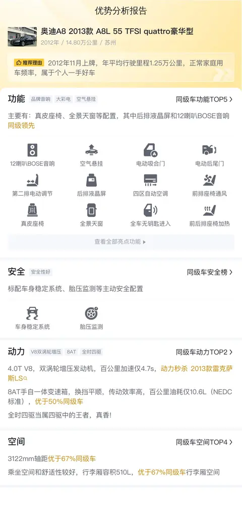 这辆二手奥迪A8 2013款 A8L 55 TFSI quattro豪华型以其出色的表现赢得了消费者的认可。它拥有豪华的配置、卓越的动力性能以及宽敞舒适的乘坐空间,无论是商务出行还是家庭出游都能轻松应对。如果您正在寻找一款性价比高的大型豪华轿车,那么这辆二手奥迪A8L无疑是一个不错的选择。