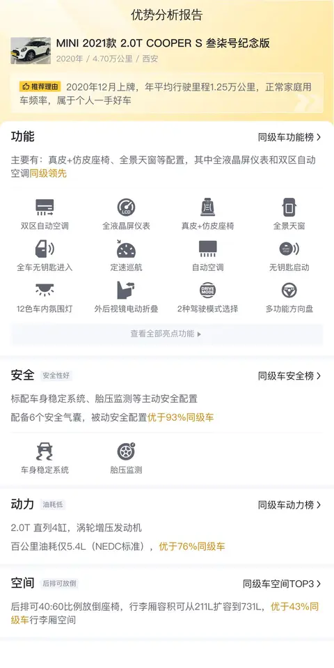 综上所述的新车含税价、用车成本、市场行情、优势分析、同款比价等数据仅供参考。在配置部分,因为二手车非标品,车辆可能会存在配置改装的情况,具体车况信息需要线下结合车辆实际情况进行综合参考。
