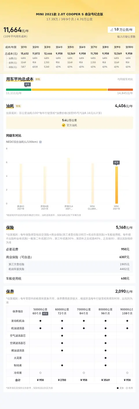 年度用车成本方面,按一年行驶一万公里计算,该型车每年燃油、保险及保养的综合用车成本约11749元,具体费用要看用车频率及使用环境而定。