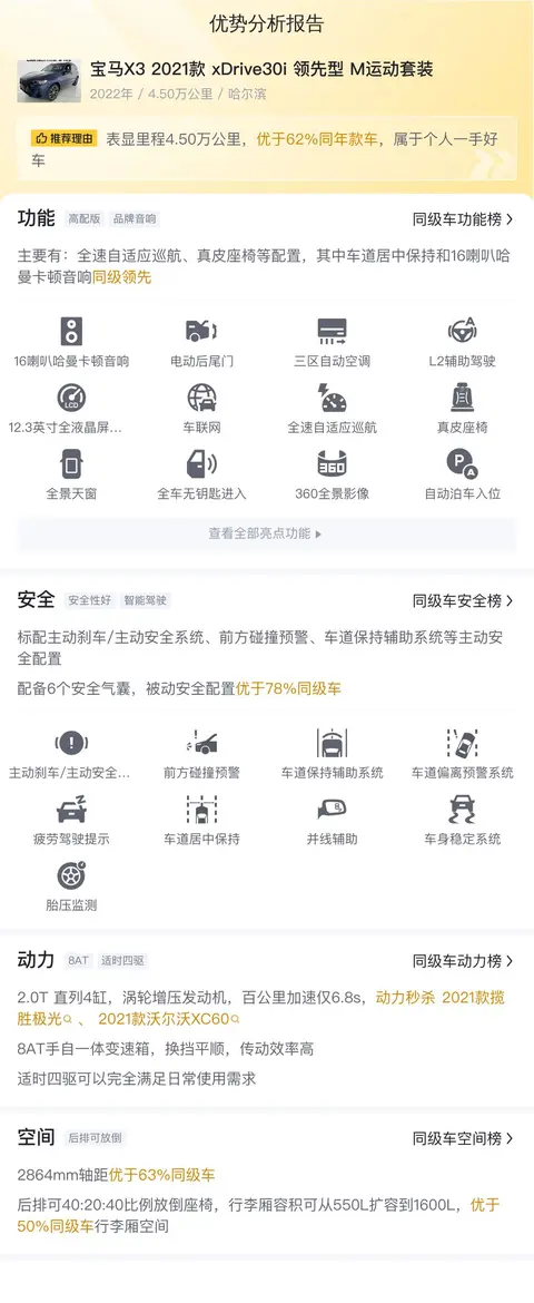 优势:蓝天白云,开出去绝对的有面子,这是很多BBA车主的心声,毕竟BBE是豪华品牌,市场知名度和影响力极高,保值率也高。这辆宝马X3 2021款 xDrive30i 领先型 M运动套装的价格实惠,配置丰富,动力强悍,是一款不错的车型。