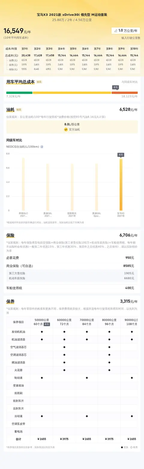 据估算,同级车的最低用车成本是6506元/年,最高是17156元/年,宝马X3 2021款 xDrive30i 领先型 M运动套装是16683元/年,所以较高。