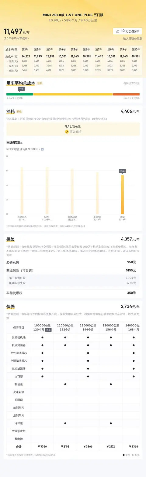 据估算,同级车的最低用车成本是4553元/年,最高是13178元/年,MINI 2018款 1.5T ONE PLUS 五门版是10678元/年,用车成本较高。