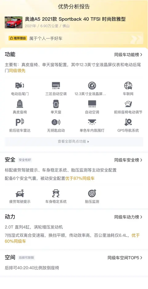 下面让我们看看今天这辆二手车的情况,该车具体版本为奥迪A5 2021款 Sportback 40 TFSI 时尚致雅型,上牌地车源地均在广东佛山,上牌日期2021年4月,表显里程6.9万公里,新车指导价37.18万,二手车报价18.88万,过户次数0次。支持分期购车,首付6万即可拥有它。