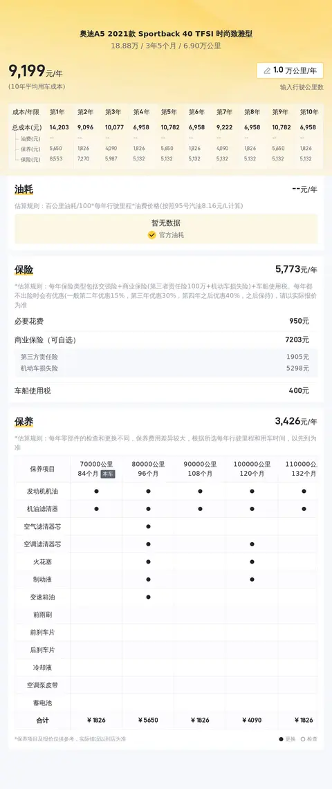 在用车成本方面,还是根据懂车帝大数据分析,这款奥迪A5的10年平均用车成本约13107元/年,其中油费约9710元/年,保险费用约4103元/年,保养费用1016元/年。油费和保险费用会根据不同车主的使用情况和选择的保险产品而有所不同,保养费用也跟不同车主的使用强度和使用习惯有着直接关系。