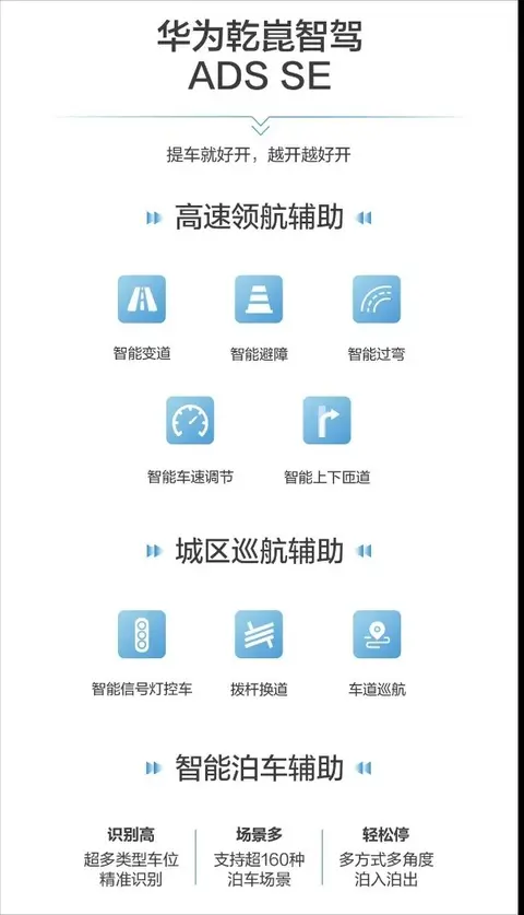 而非乾崑智驾ADS SE版,则提供智能泊车辅助(APA)、遥控泊车辅助(RPA)(OTA后期升级)、集成式自适应巡航辅助(IACC)等功能。