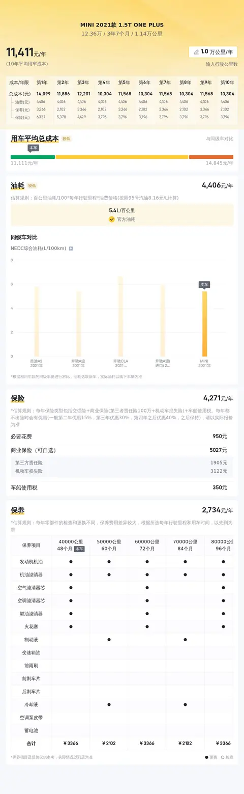 养车嘛,总得算算成本。根据大数据分析,预计这辆MINI每年的保养费用也就1085元,保险费用大约是3727元,当然啦,这费用还得根据你选的保险套餐来定。开空调嘛,得费点油,但话说回来,这年头谁不开空调呢?算了,这笔费用就不算进去了。话说这辆MINI啊,它性格温油,吃得也不多,百公里油耗才5.4L,按照当前的油价来算,一年跑个一万公里,油费也就4362元。这么一算,养这么一辆MINI,钱包压力还真不大。但别忘了,买车容易养车难,咱们还得预留一些银子,以防万一有啥突发状况呢。