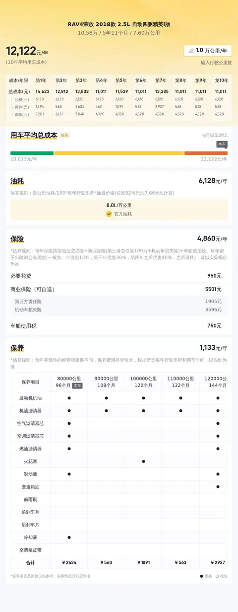 据估算,同级车的最低用车成本是8910元/年,最高是12173元/年,RAV4 荣放 2018 款 2.5L 自动四驱精英 i 版是12173元/年,所以用车成本较高。
